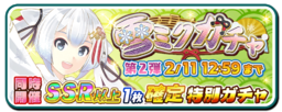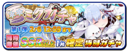 101 ~ 390 | SSR+ SNOW MIKU 2018 Crane Ver. x1 SR+ Mini Crane Priestess Miku x3 Ranking Medal x600 Gacha Ticket x1 | ||